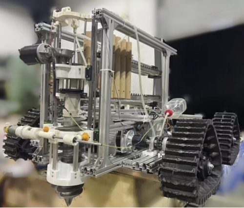 由陈永洪、任红老师指导,谢渝、蔡松岚、杨魏吉、罗天佑、阿布都萨米江·阿布都卡哈尔等同学设计制作的作品“柳绿者-沙漠植树一体机”,为一款针对沙漠绿化常用植株-沙柳的全自动植树一体机。该作品自主创新设计了多功能中空钻头,解决了沙土流动性导致沙土回填,挖坑难的问题;钻孔-插苗-培土-灌水一体化的钻头设计使整个装置结构更紧凑,效率更高;槽轮和变异凸轮机构的结合设计,实现了一个电机控制整个间歇送苗运动;采用“弹夹”式送苗机构,便于拆卸更换,大大提高了种植效率;“母子机”智能化控制系统的设计,母机作为能源补给站及监控管理站,一台母机运营管理10台子机,采用物联网技术控制其工作路线以及工作状态。作品能较好地解决沙漠人工种植条件恶劣、树苗存活率低、种植效率低等问题,具有较强的实用性和广阔的应用前景。